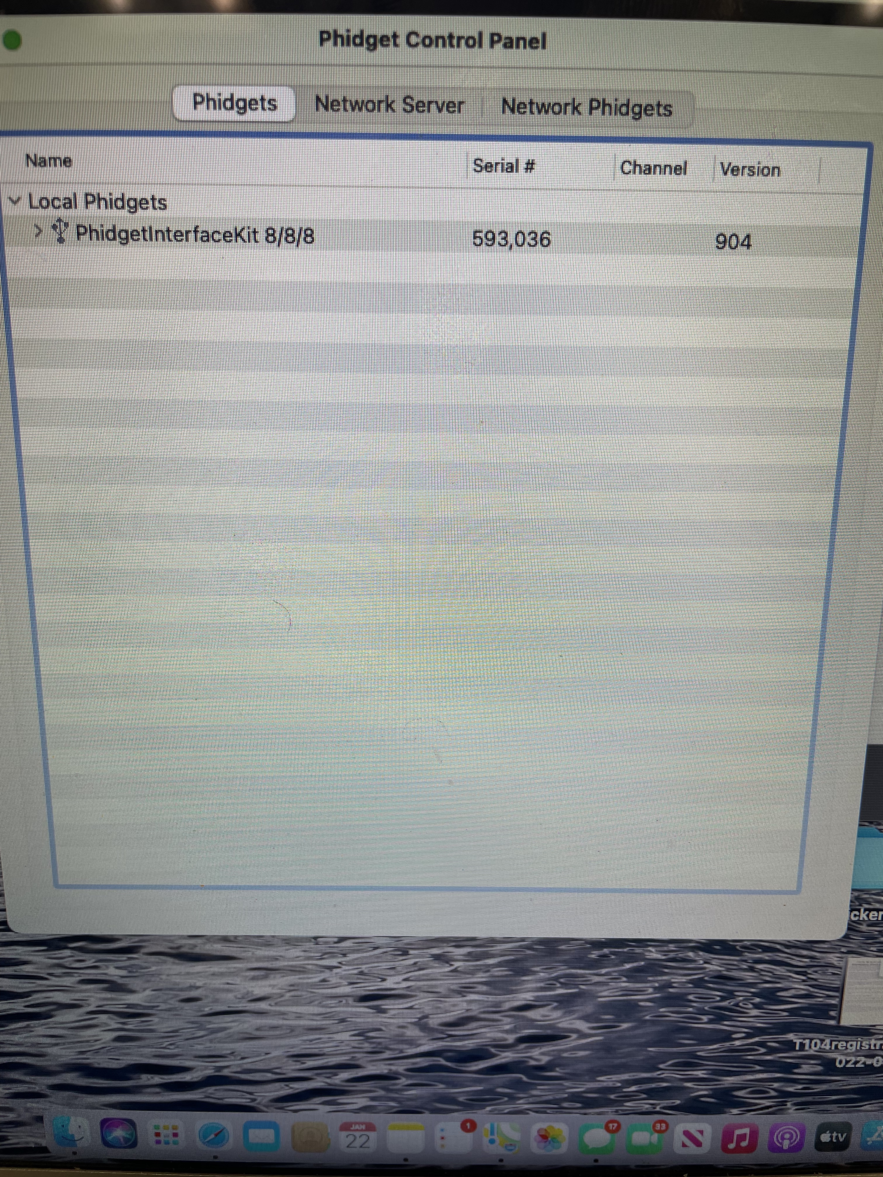 I received the new usb cable today. At 1st it was the same result. only showing Phidget 8/8/8, so I opened the control panel, and re-seated all usb connections. At that point is showed Phidget 8/8/8 and Phidget 4 sensor! It seems all is operational with the exception of board temp. I think we are almost there!