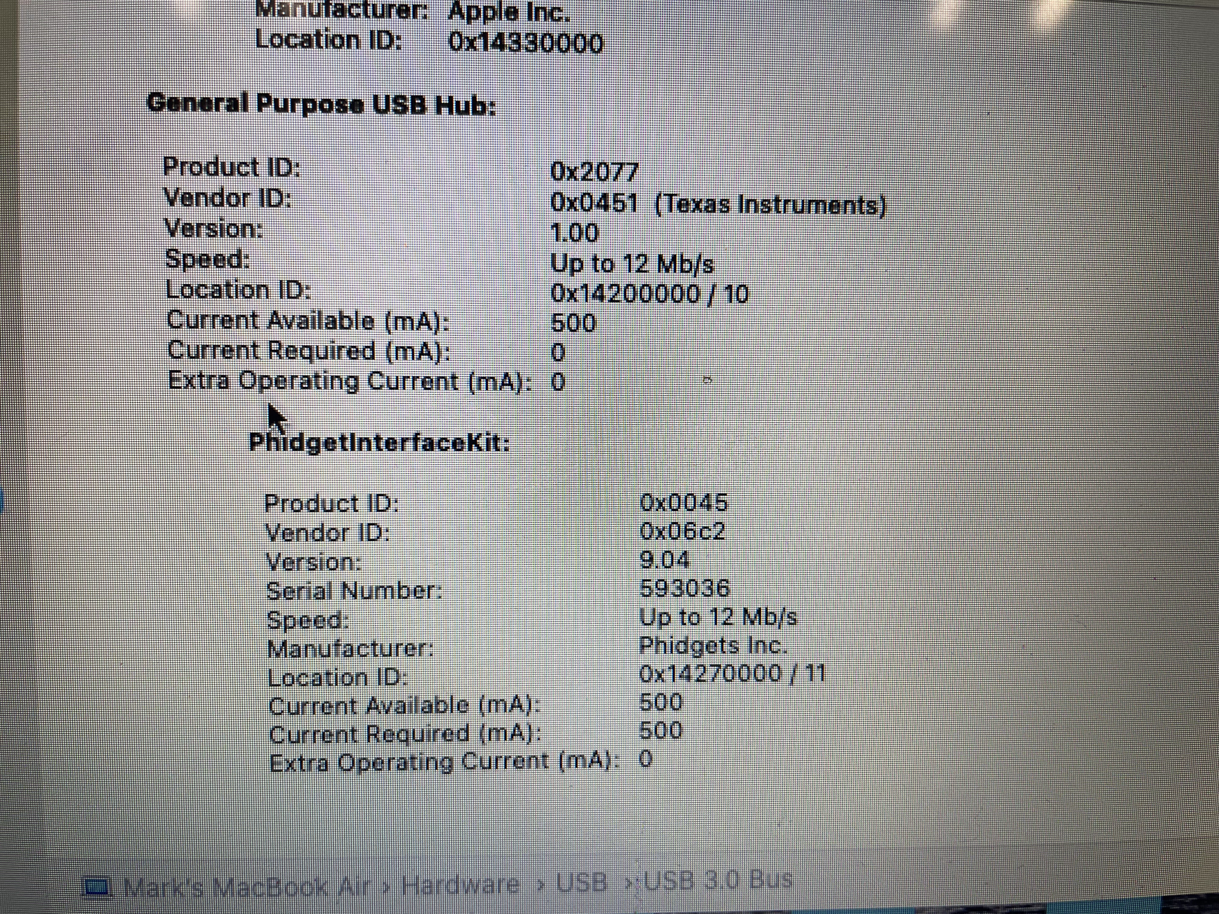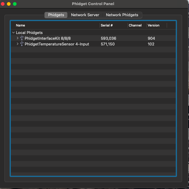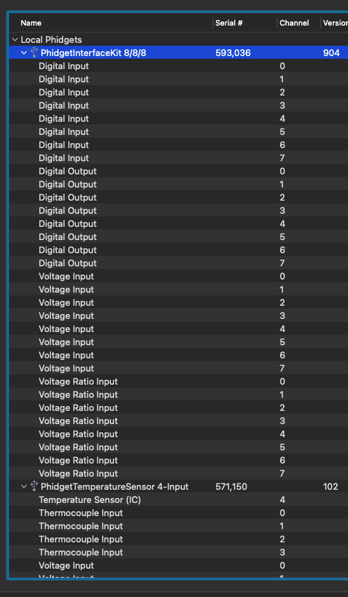 HI Marko & Nico, I received the new usb cable today. At 1st it was the same result. only showing Phidget 8/8/8, so I opened the control panel, and re-seated all usb connections. At that point is showed Phidget 8/8/8 and Phidget 4 sensor! It seems all is operational with the exception of board temp. I think we are almost there! |