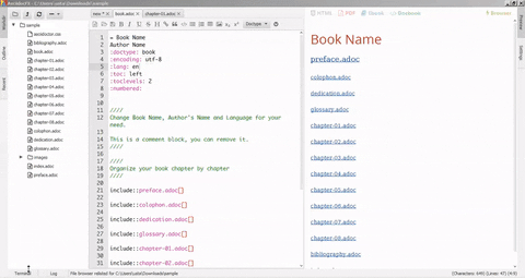 Asciidoc FX is an WYSIWYG editor for Asciidoc markup language. You can build PDF, Epub, and HTML books, documents and slides. AsciidocFX is also a winner of Duke’s Choice Award 2015.