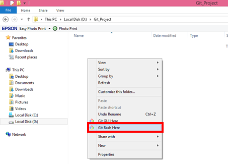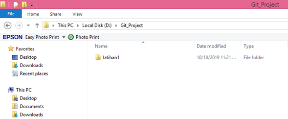 - Buka direktori aktif terlebih dahulu, yang akan kita jadikan tempat penyimpanan file latihan atau project kita dengan menggunakan windows Explorer. Misalnya di D:\Git_Project.