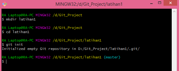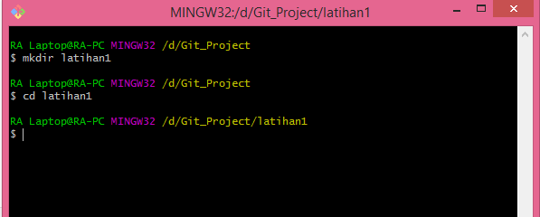 - Buatlah direktori praktikum project pertama kalian dengan nama Latihan1, caranya adalah dengan mengetik perintah berikut pada git bash command yang tadi kita buka.