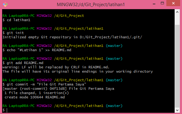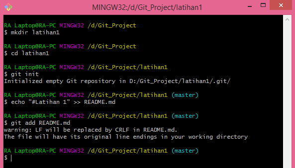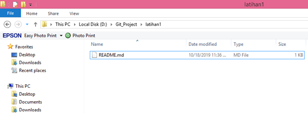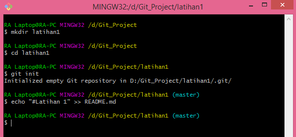 Cd latihan1 Setelah kita membuat folder yang bernama latihan1, sekarang kita membuat file yang diberi nama README.md, cara membuatnya adalah dengan memasukkan perintah pada git seperti berikut :