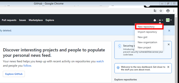 - Pada halaman utama http://github.com, klik ikon “+” lalu klik New Repository.