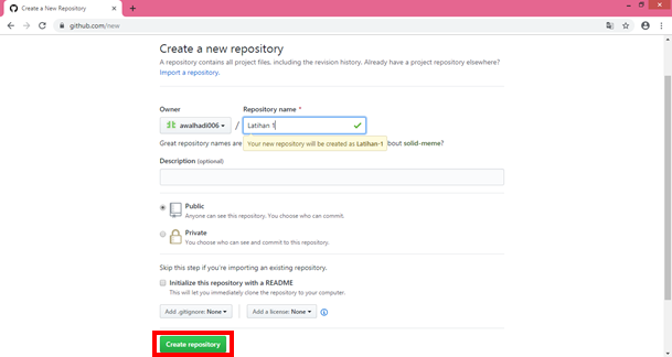 Buatlah repository baru misalnya dengan nama “Latihan 1”, Lalu klik tombol Create Repository.