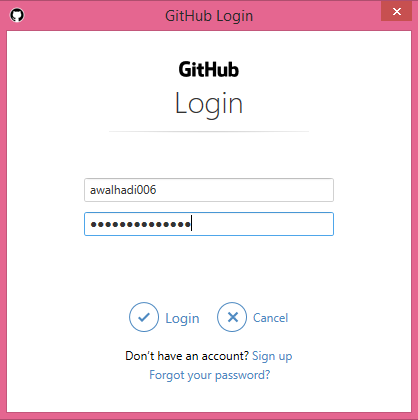 - Masukan username dan password sesuai dengan yang kita daftarkan saat membuat akun di http://github.com.