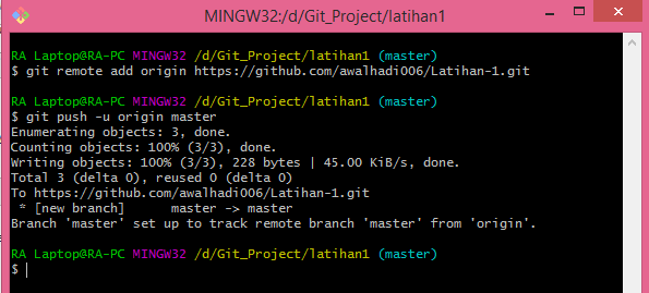 - Saat pertama kali menggunakan perintah ini, maka kita akan diminta memasukan username dan password pada akun http://github.com.
