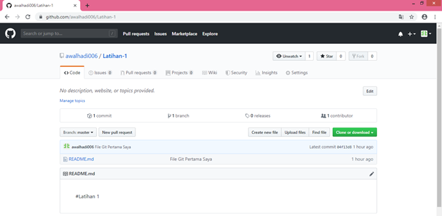 - Untuk melihat berhasil atau tidak file README.md kita upload ke server repository kita, silahkan refresh halaman http://github.com nya, jika tampilannya seperti gambar dibawah ini, maka anda telah berhasil memasukkan file README.md ke dalam server repository yang telah anda buat sebelumnya.