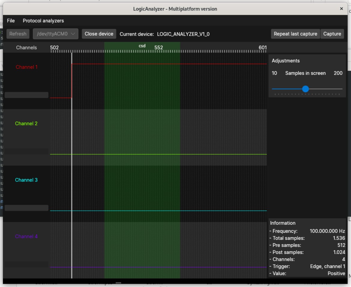 Conneced to device LOGIC_ANALYZER_V1_0 in port /dev/ttyACM0