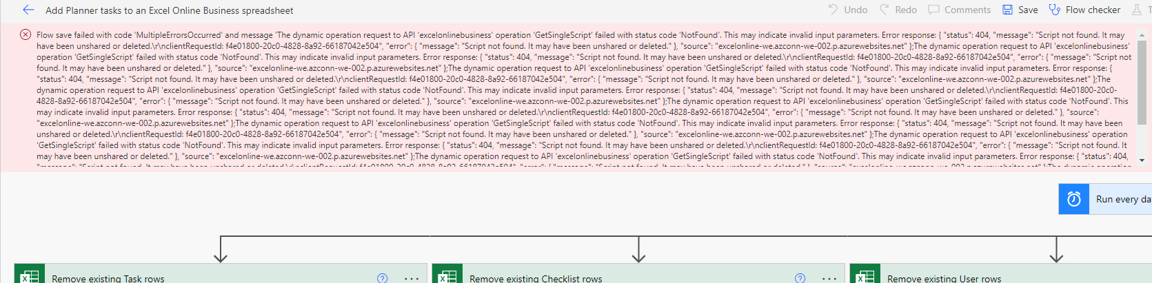 Flow save failed with code 'MultipleErrorsOccurred' and message 'The dynamic operation request to API 'excelonlinebusiness' operation 'GetSingleScript' failed with status code 'NotFound'. This may indicate invalid input parameters. Error response: { "status": 404, "message": "Script not found. It may have been unshared or deleted.\r\nclientRequestId: f4e01800-20c0-4828-8a92-66187042e504", "error": { "message": "Script not found. It may have been unshared or deleted." }, "source": "excelonline-we.azconn-we-002.p.azurewebsites.net" };