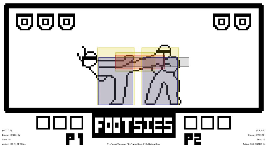FOOTSIES is a 2D fighting game where players can control character movement horizontally and use one attack button to perform normal and special moves to defeat their opponent. While the controls (and graphics) are super simple, FOOTSIES retains the fundamental feeling of fighting game genre where spacing, hit confirm and whiff punish are keys to achieve victory.