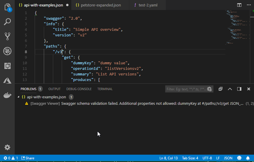 Swagger Viewer validates your documents against Swagger 2.0 and OpenAPI specifications. If there are any issues it will be shown as a warning in the problems panel. Right now only one validation error will be shown even if there are multiple issues.