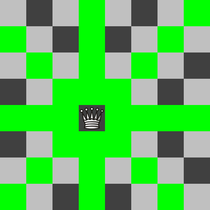 The queen is the most powerful piece in the game because she has the combined powers of a rook and a bishop! See below the example of all the places that the queen can move to!
