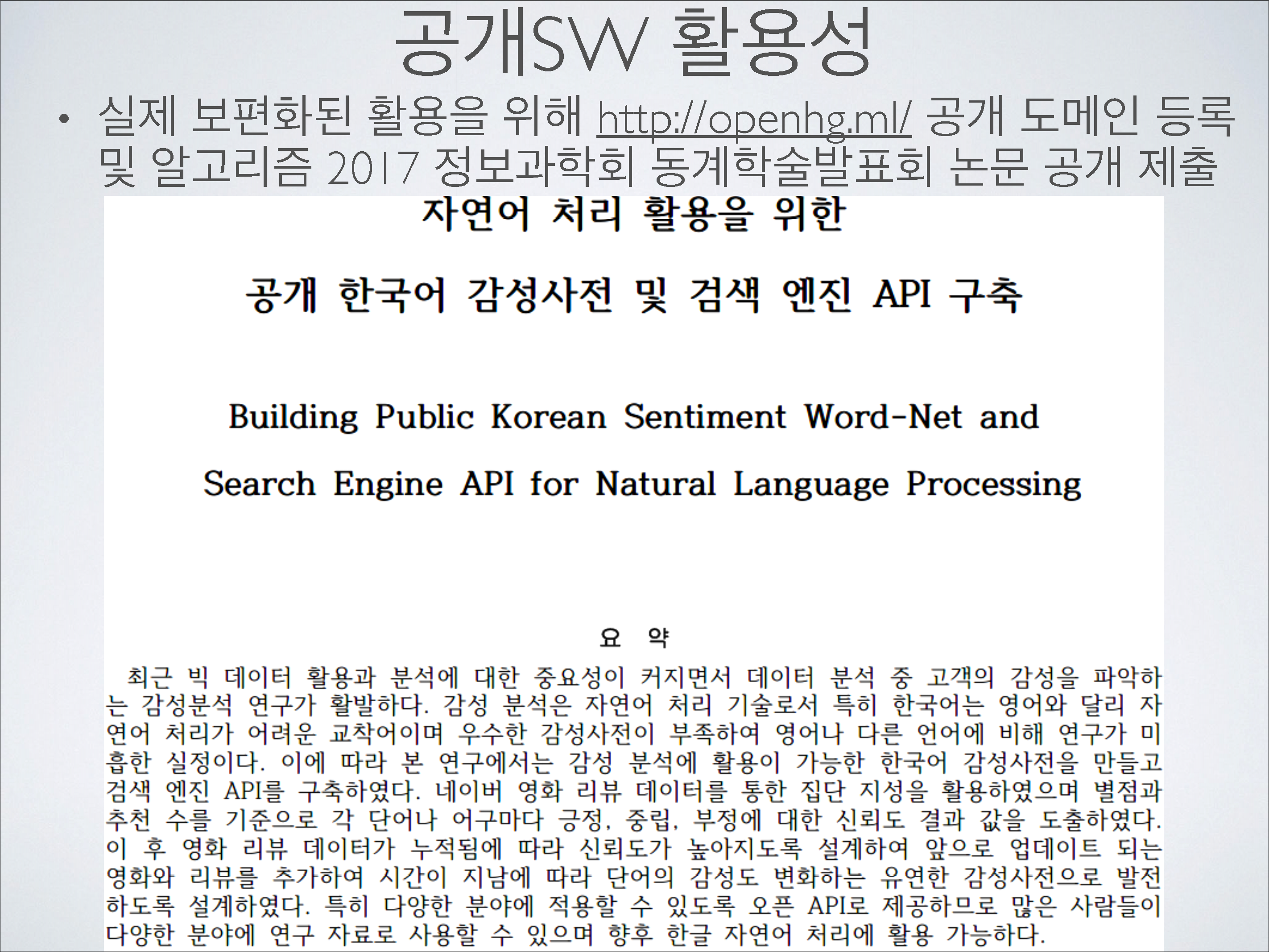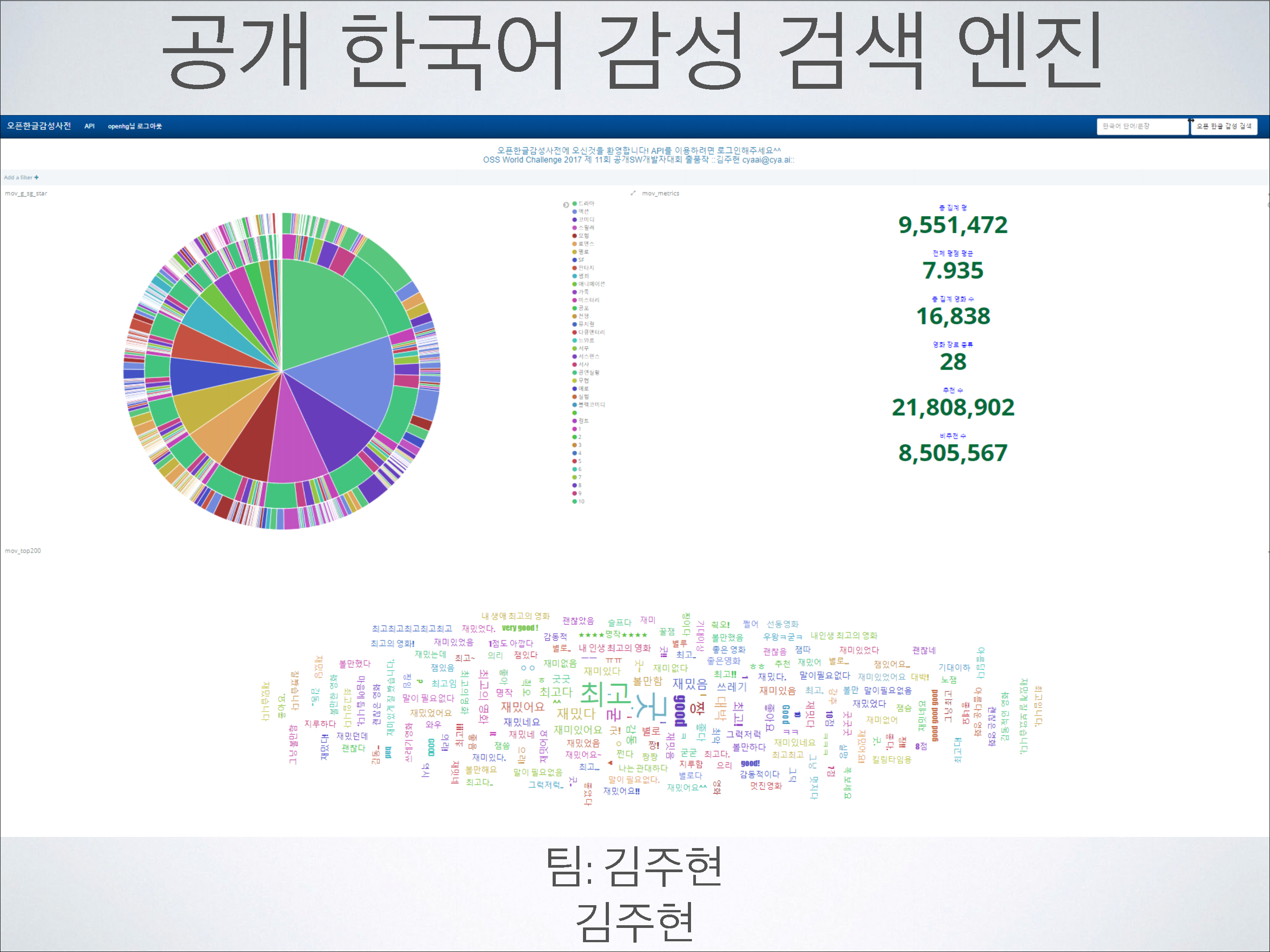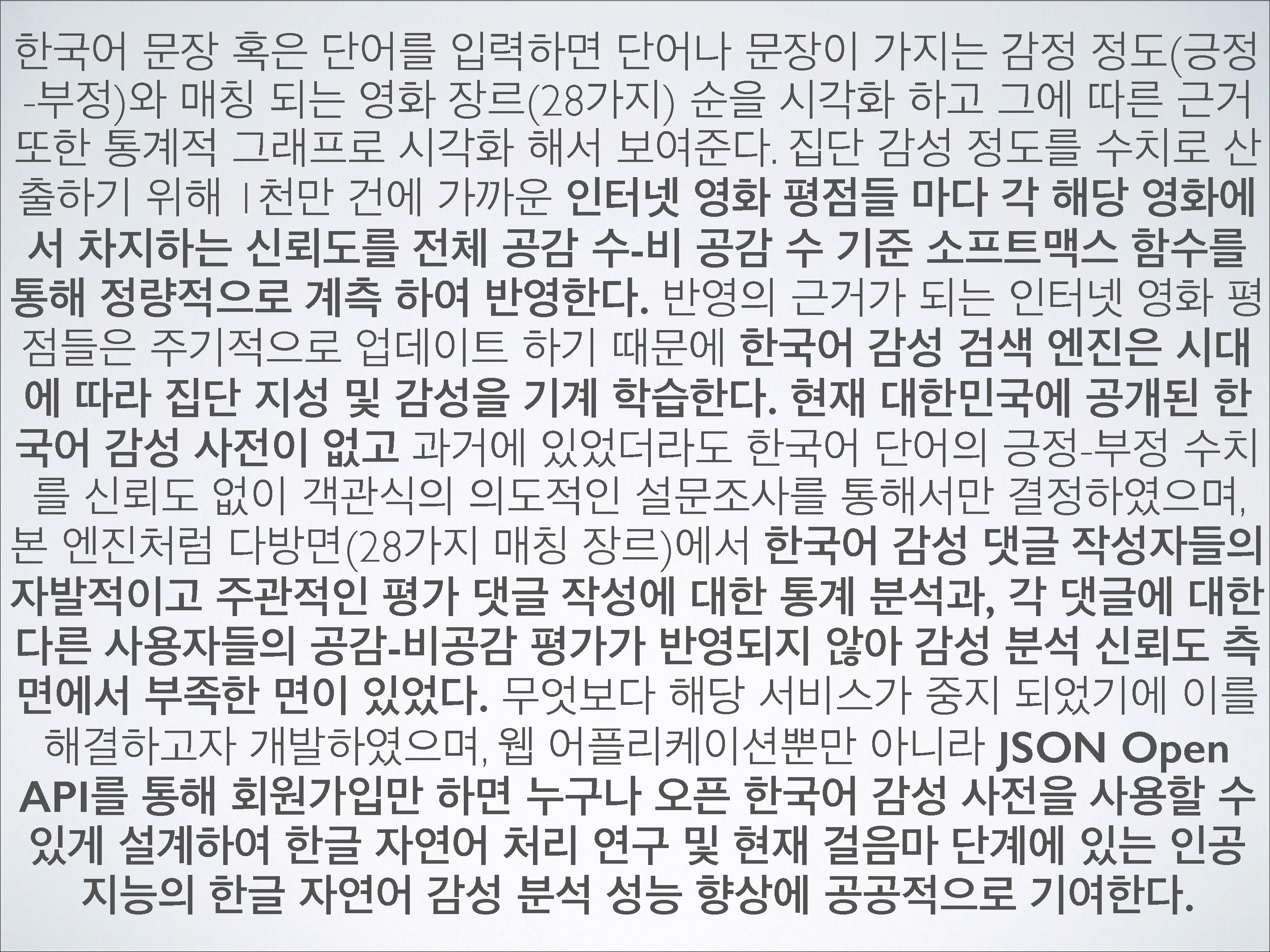한국어 문장 혹은 단어를 입력하면 단어나 문장이 가지는 감정 정도(긍정-부정)와 매칭 되는 영화 장르(28가지) 순을 시각화 하고 그에 따른 근거 또한 통계적 그래프로 시각화 해서 보여준다. 집단 감성 정도를 수치로 산출하기 위해 1천만 건에 가까운 인터넷 영화 평점들 마다 각 해당 영화에서 차지하는 신뢰도를 전체 공감-비 공감 수 기준 소프트맥스 함수를 통해 정량적으로 계측 하여 반영한다. 반영의 근거가 되는 인터넷 영화 평점들은 주기적으로 업데이트 하기 때문에 한국어 감성 검색 엔진은 시대에 따라 집단 지성 및 감성을 기계 학습한다. 현재 대한민국에 공개된 한국어 감성 사전이 없고 과거에 있었다 하더라도 한국어 단어의 긍정-부정 수치를 신뢰도 없이 객관식의 의도적인 설문조사를 통해서만 결정하였으며, 본 엔진처럼 다방면(28가지 매칭 장르)에서 한국어 감성 댓글 작성자들의 자발적이고 주관적인 평가 댓글 작성에 대한 통계 분석과, 각 댓글에 대한 다른 사용자들의 공감-비공감 평가가 반영되지 않아 감성 분석 신뢰도 측면에서 부족한 면이 있었다. 무엇보다 해당 서비스가 중지 (http://openhangul.com/restrict) 되었기에 이를 해결하고자 개발하였으며, 웹 어플리케이션뿐만 아니라 JSON Open API를 통해 회원가입만 하면 누구나 오픈 한국어 감성 사전을 사용할 수 있게 설계하여 한글 자연어 처리 연구 및 현재 걸음마 단계에 있는 인공지능의 한글 자연어 감성 분석 성능 향상에 공공적으로 기여한다.
