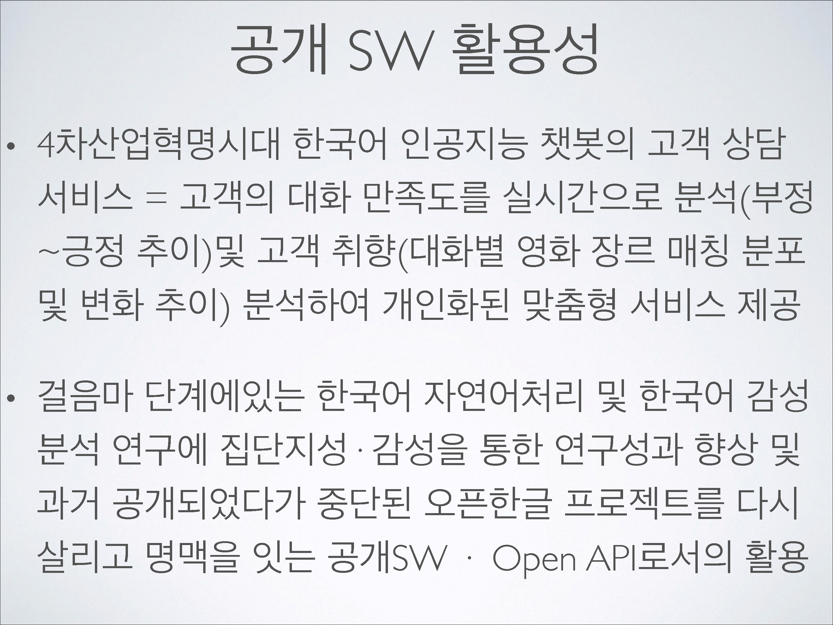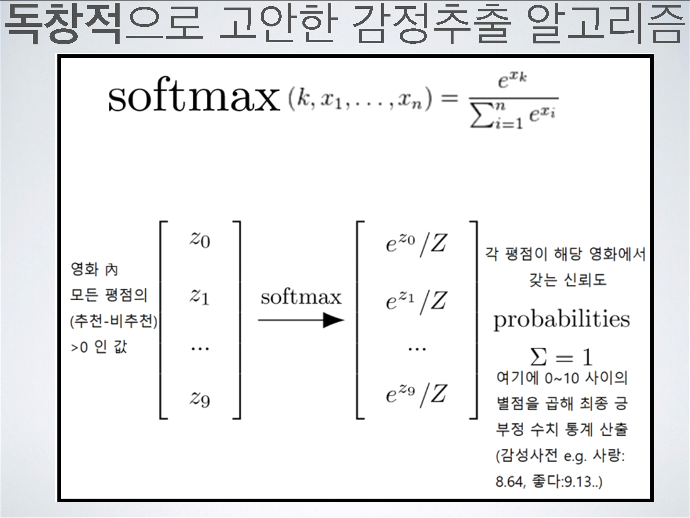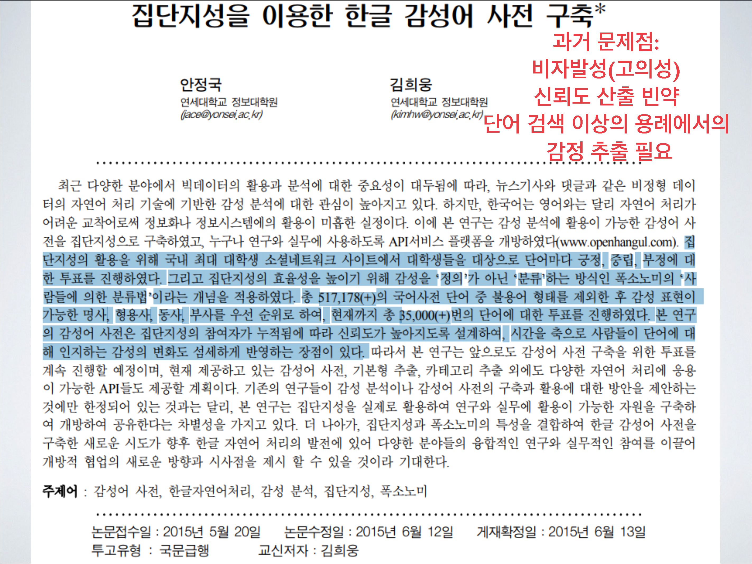 한국어 문장 혹은 단어를 입력하면 단어나 문장이 가지는 감정 정도(긍정-부정)와 매칭 되는 영화 장르(28가지) 순을 시각화 하고 그에 따른 근거 또한 통계적 그래프로 시각화 해서 보여준다. 집단 감성 정도를 수치로 산출하기 위해 1천만 건에 가까운 인터넷 영화 평점들 마다 각 해당 영화에서 차지하는 신뢰도를 전체 공감-비 공감 수 기준 소프트맥스 함수를 통해 정량적으로 계측 하여 반영한다. 반영의 근거가 되는 인터넷 영화 평점들은 주기적으로 업데이트 하기 때문에 한국어 감성 검색 엔진은 시대에 따라 집단 지성 및 감성을 기계 학습한다. 현재 대한민국에 공개된 한국어 감성 사전이 없고 과거에 있었다 하더라도 한국어 단어의 긍정-부정 수치를 신뢰도 없이 객관식의 의도적인 설문조사를 통해서만 결정하였으며, 본 엔진처럼 다방면(28가지 매칭 장르)에서 한국어 감성 댓글 작성자들의 자발적이고 주관적인 평가 댓글 작성에 대한 통계 분석과, 각 댓글에 대한 다른 사용자들의 공감-비공감 평가가 반영되지 않아 감성 분석 신뢰도 측면에서 부족한 면이 있었다. 무엇보다 해당 서비스가 중지 (http://openhangul.com/restrict) 되었기에 이를 해결하고자 개발하였으며, 웹 어플리케이션뿐만 아니라 JSON Open API를 통해 회원가입만 하면 누구나 오픈 한국어 감성 사전을 사용할 수 있게 설계하여 한글 자연어 처리 연구 및 현재 걸음마 단계에 있는 인공지능의 한글 자연어 감성 분석 성능 향상에 공공적으로 기여한다.