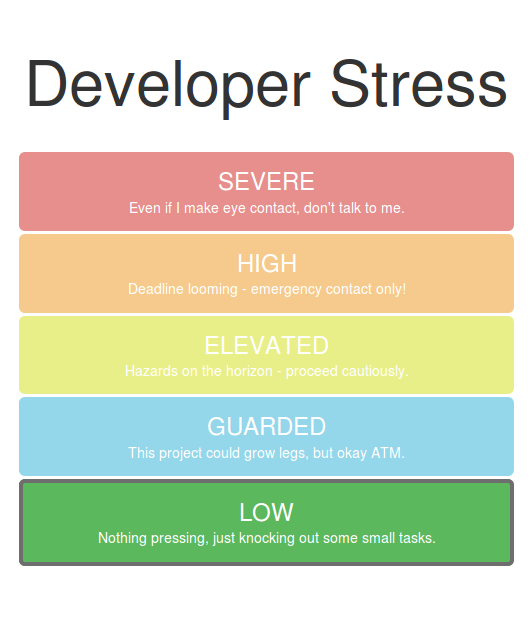 Dev Mode shows your developer's stress level in the manor of the color codes once used by the Department of Homeland Security to show the nation's terror alert level.