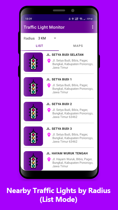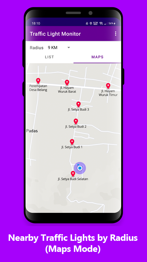 - Nearby traffic lights by radius (maps mode).