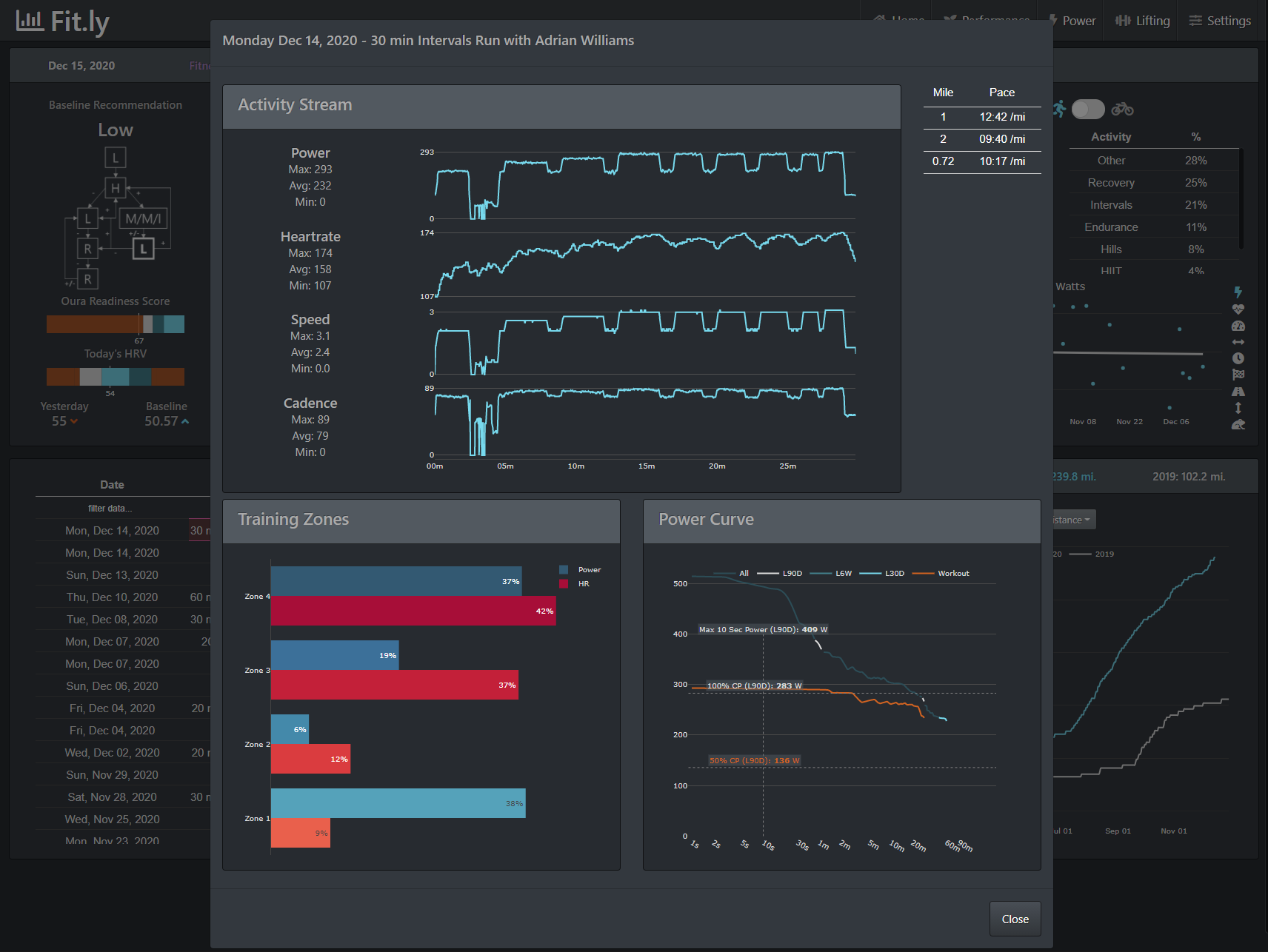 Fitly can keep a history of every song you listen to on spotify and analyze your listenind behavior (skipped, fast forwarded, rewound ,etc.) to determine song likeablity. Listening behavior can then be analyzed by activity type and intensity (i.e what music do you listen to during high intensity runs), clustered into music type (K-means cluster on spotify audio features) and playlists can be automatically generated with recommended music for your next recommended workout.