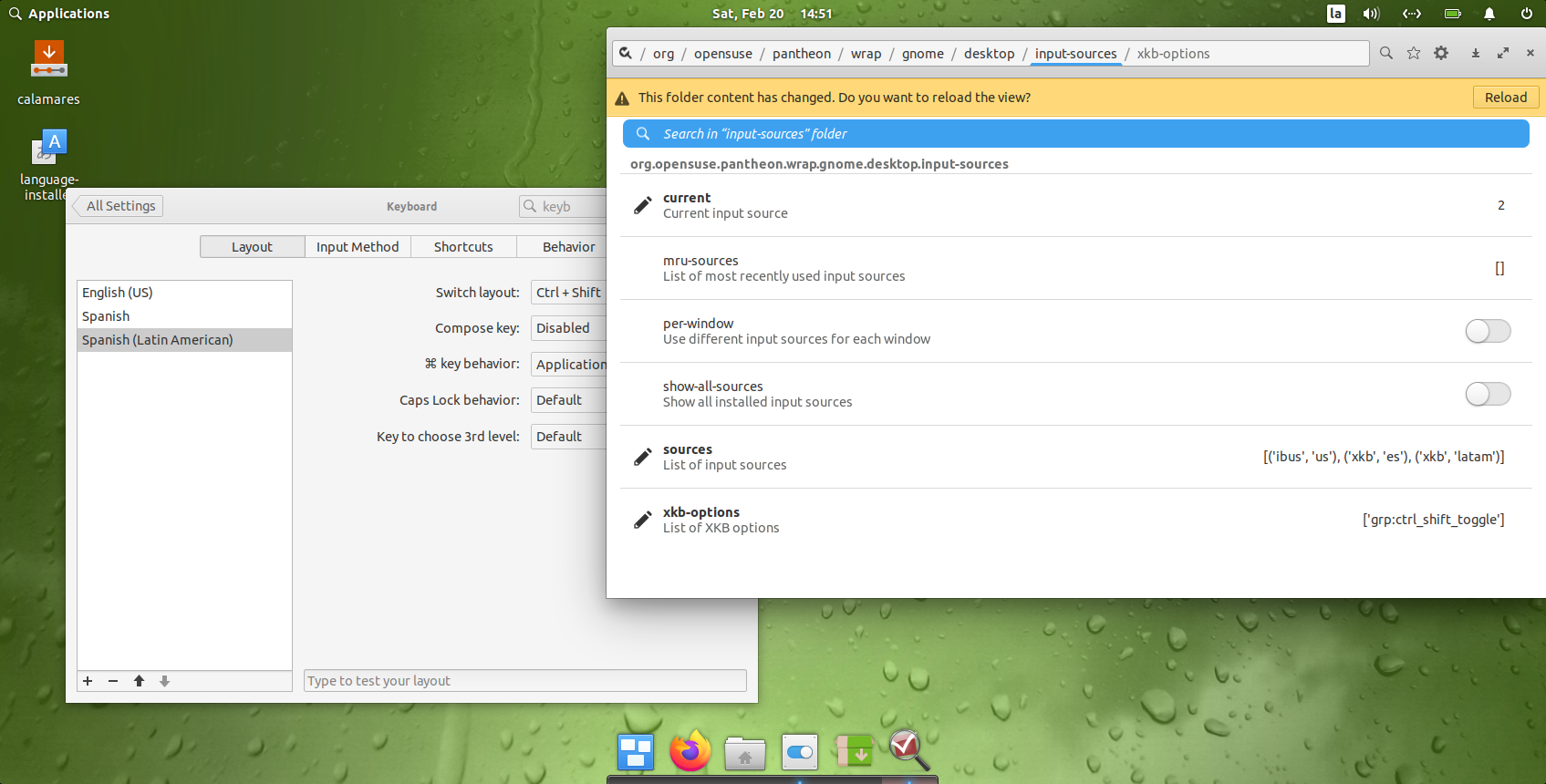 Hi there, The way Pantheon is built for openSUSE so as to not interfere with Gnome settings is by using a wrapper, so the relevant dconf path is org > opensuse > pantheon > wrap > gnome. So it appears that this is an upstream Pantheon issue. When I added just one additional language it does not show the language indicator, but when I added one more for a total of three input languages the indicator appeared. But the keyboard shortcut for switching does work, so I personally just use that. Or you can add any other random 3rd language and get the indicator to appear. |