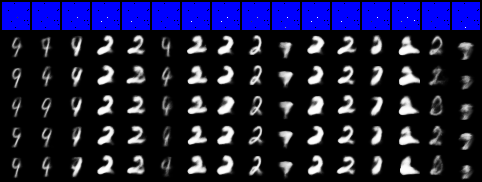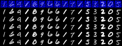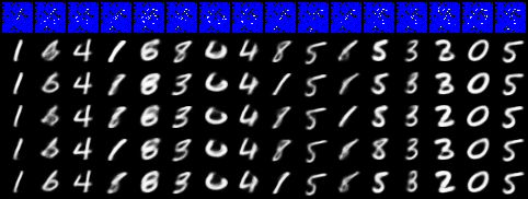 The first row shows the observed greyscale context points. Unobserved pixels are in blue.