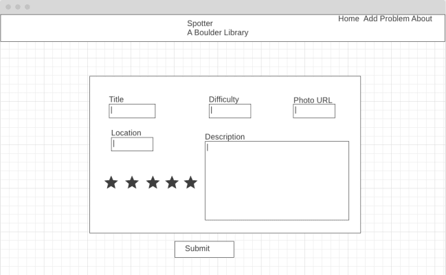 Spotter is a bouldering library for climbers. View problems that others have posted, the difficulty of the climb, how they rated it, where it was located, and a description of the climb/beta(best moves to finish the climb). Rate the climbs if you've finished them, and search for climbs in a specific area.