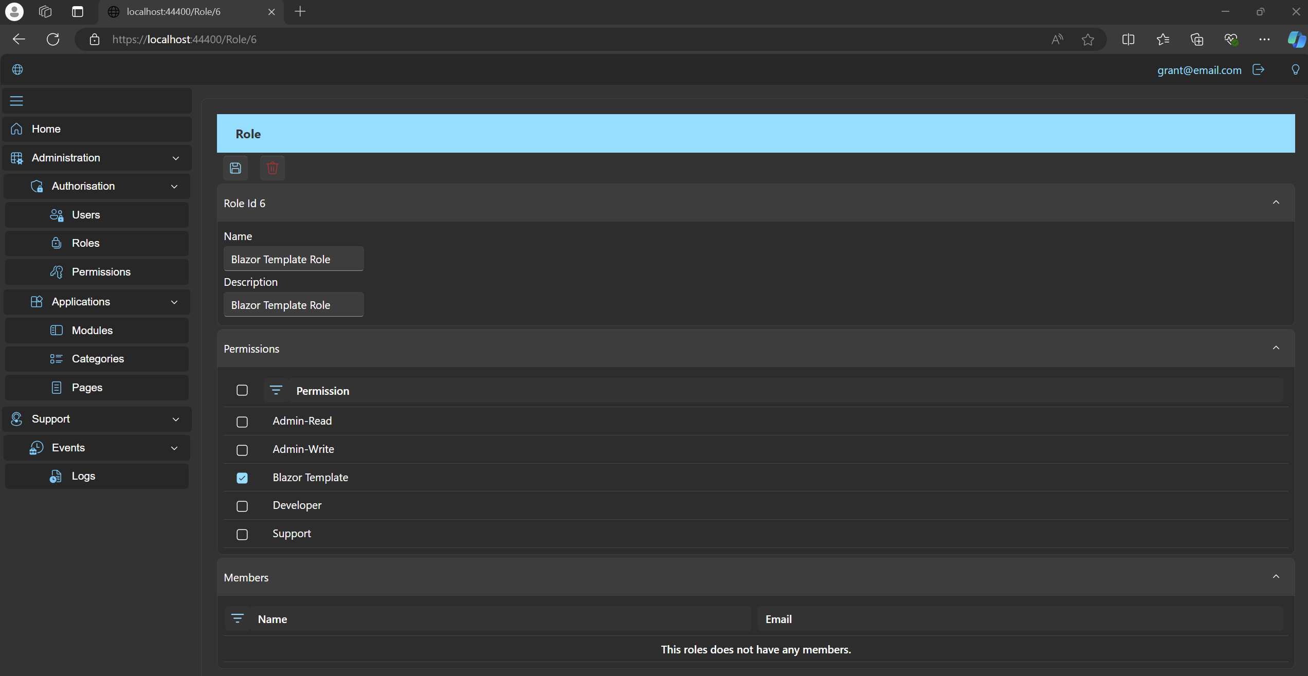 Create the role Blazor Template Roleand assign it theBlazor-Templatepermission.