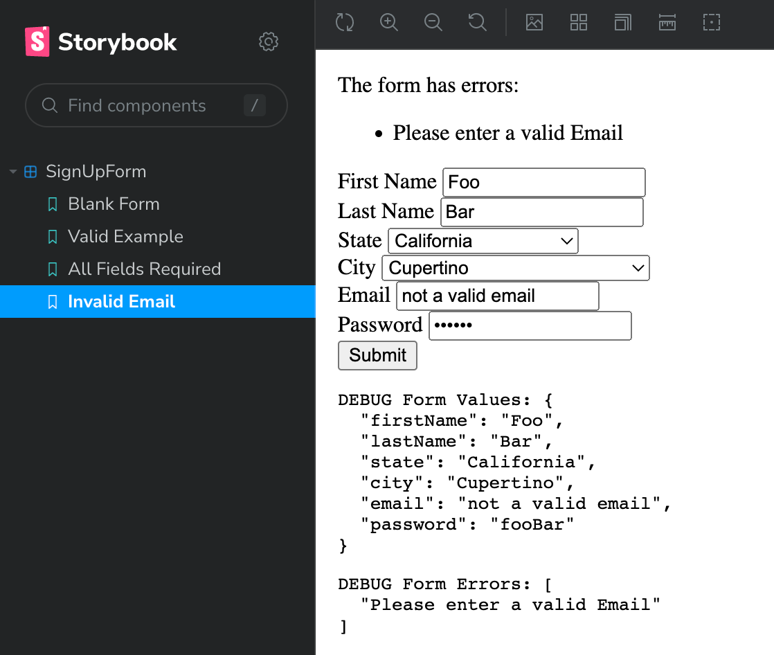 Storybook stories, for demonstrating form validation and onSubmit behavior, are defined in:
