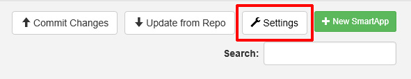 First, find the Settings button at the top of SmartThings IDE page (this will only appear after completing the one time integration with GitHub)