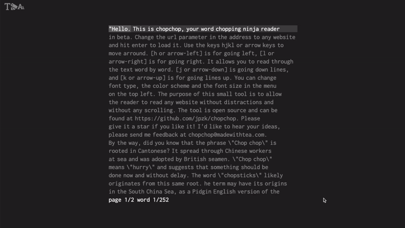 A word chopping ninja reader. Change the url parameter in the address to any website and hit enter to load it. The purpose of this small tool is to allow the reader to read any website without distractions and without any scrolling. By the way, it has VIM controls.