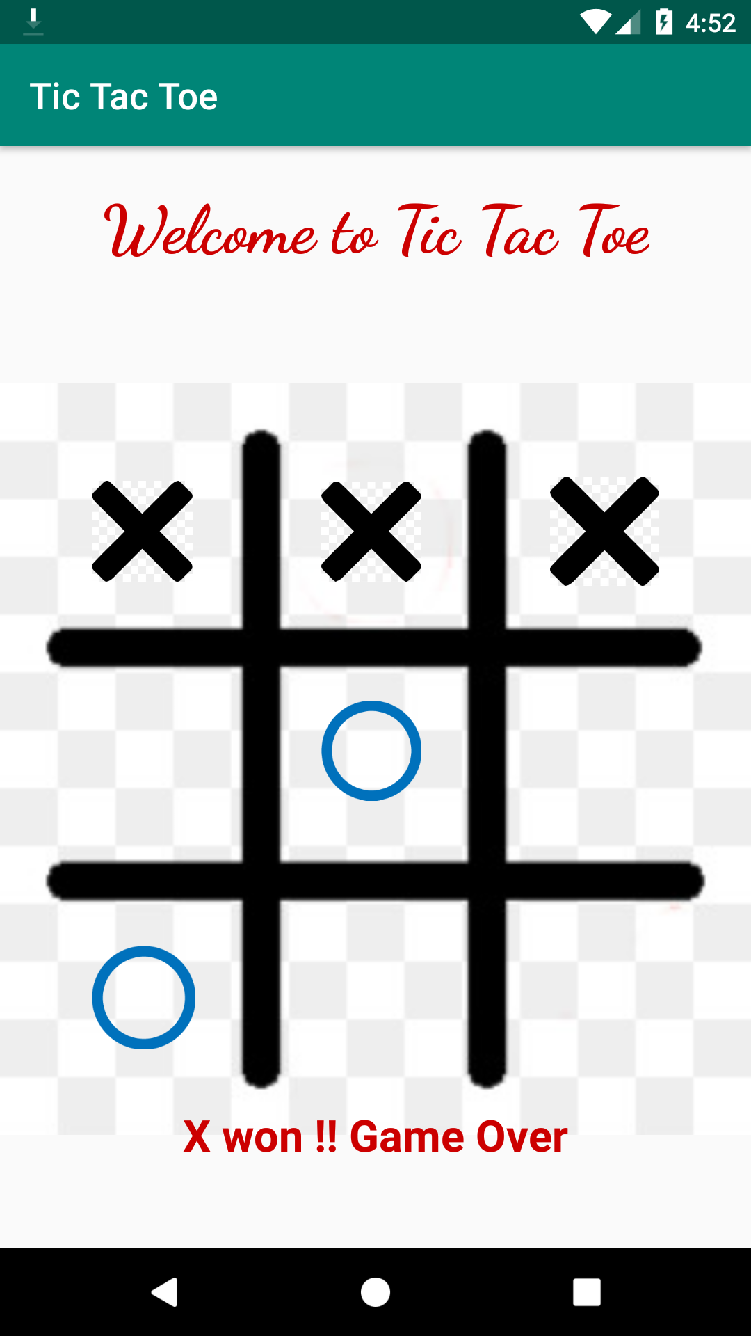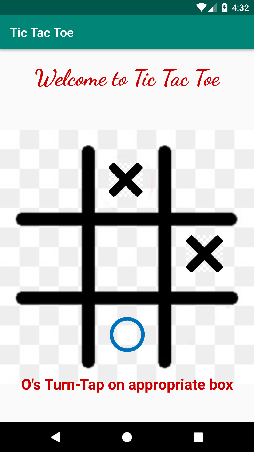 Sun-Chokdi is an android application for playing standard 2-player tic-tac-toe game. It provides a board to put 'X's and 'O's and displays the result at the end of the game. So currently it is just a single-screen application that has a huge scope of further improvements and enhancements be it in terms of adding a new feature like playing against machine, storing game results or changing the UI, etc.