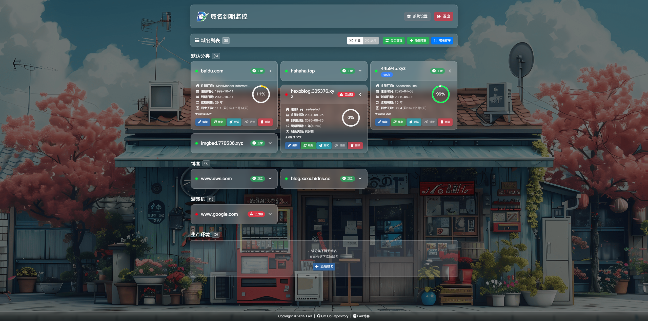dpdns.org之类的,可能有人注册了好几个,需要定期点击续期,或者有些白嫖的一年的域名,可以帮助进行到期监控,避免忘记到期时间。 - 主要功能:日期监控、价格记录、注册商记录、自定义标签、自定义续费链接、telegram提前通知。