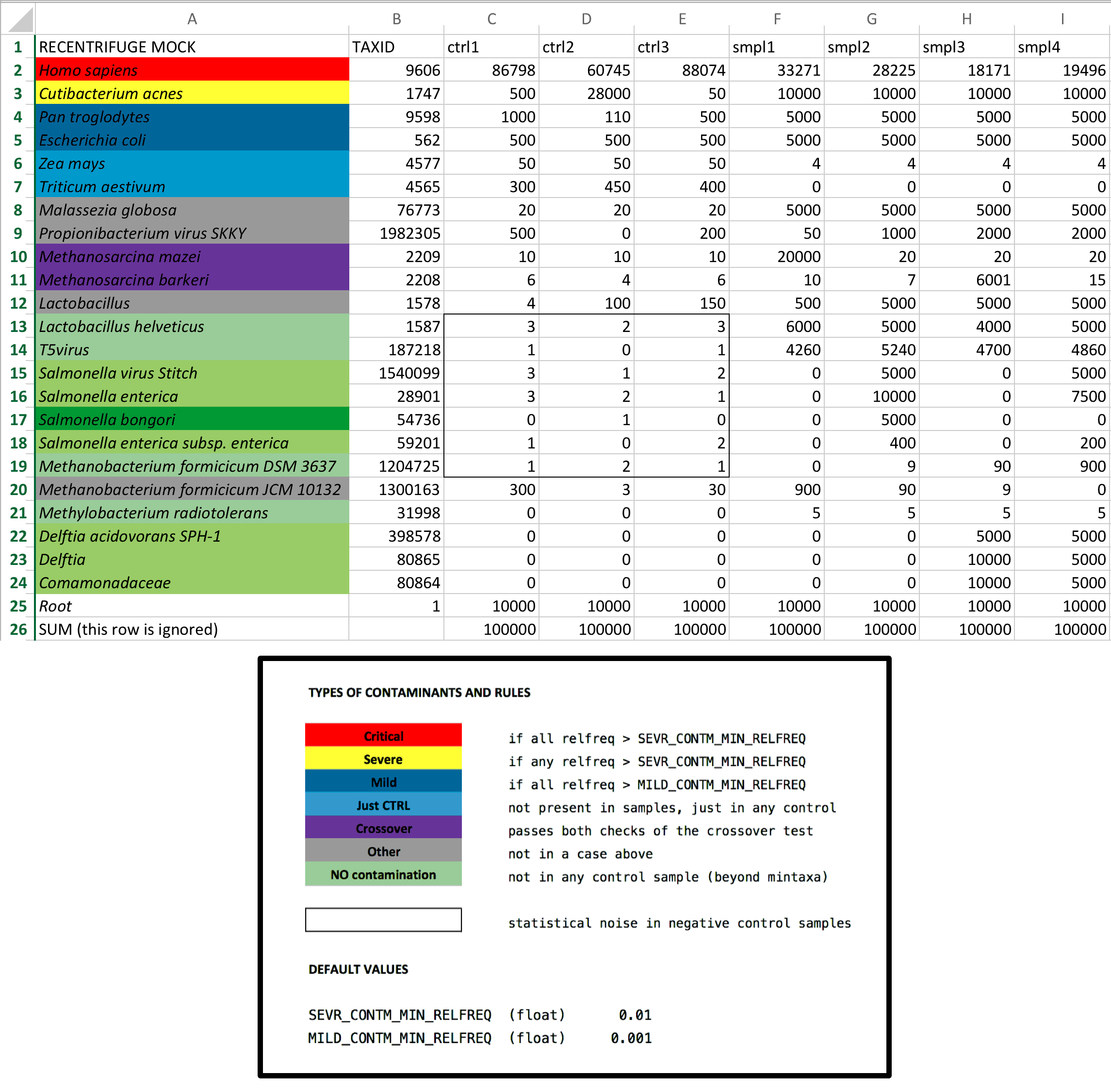 The following figure details the design of the mock community, which has been carefully devised to challenge the robust contamination removal algorithm of Recentrifuge.