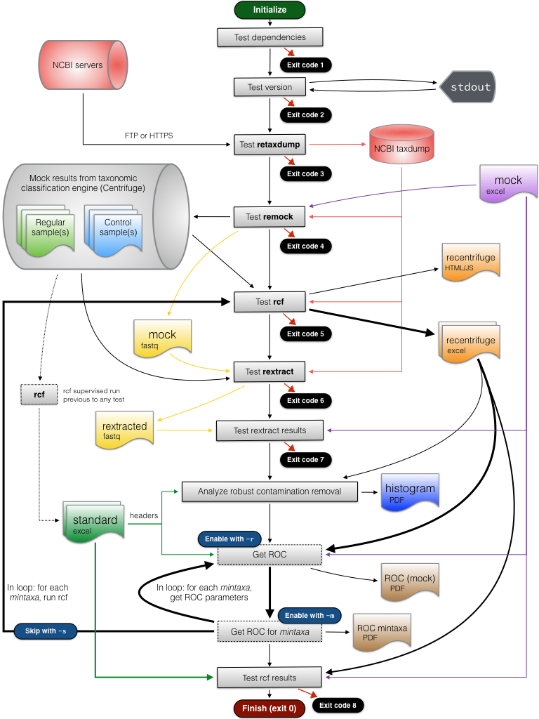 In typical use, the program performs different tests on the components of Recentrifuge package. If all the tests are passed, retest exits with code 0. An exit code different from 0 indicates the number of the testing stage that has failed. The flowchart below shows the main workflow of retest, including the relation of the different exit values to the testing steps: