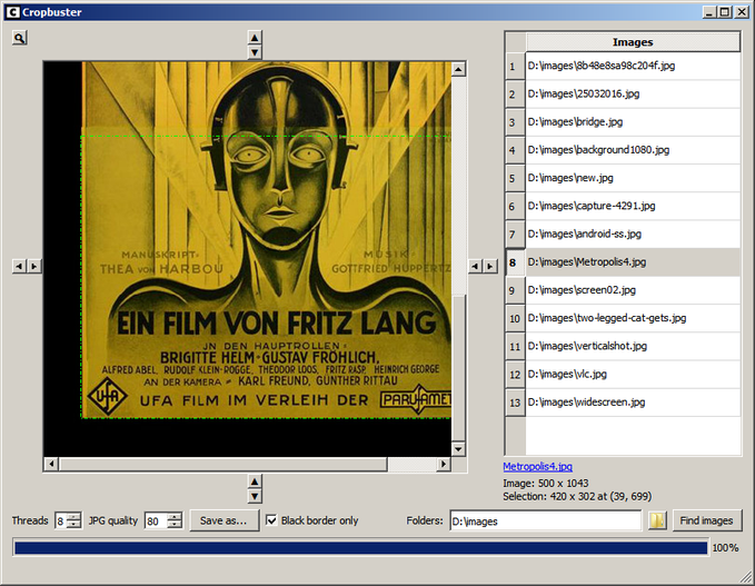 Cropbuster can quickly scan through a large collection of jpegs and display only those images that have a border (frame). Such images can include screen captures, image macros (memes) or digital art. Cropbuster can detect where the actual image inside the border is and allows you to save this image with the border removed.