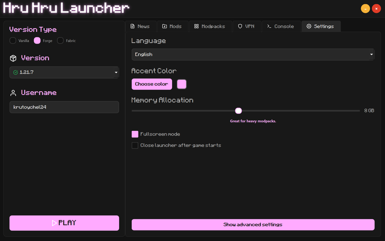 Hru Hru Launcher is a custom Minecraft launcher built with Python and PySide6, providing a sleek interface for launching various Minecraft versions, including Vanilla, Forge, and Fabric. It features customizable settings, console output, and dynamic version loading.