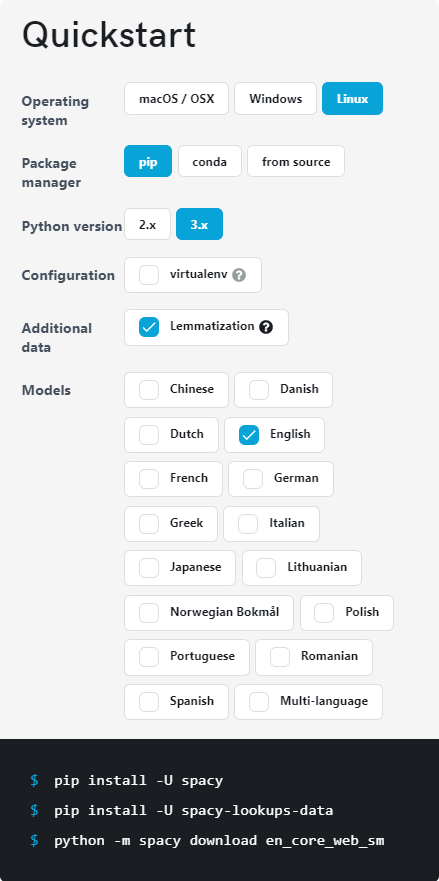 pip install -U spacy-lookups-datafor lemmatization? (screenshot) - Does current use of Lemminflect bypass ^, and not need that installation? Which produces better lemmas? (Do some testing b/w spacy-lookups, lemminflect, stanza)