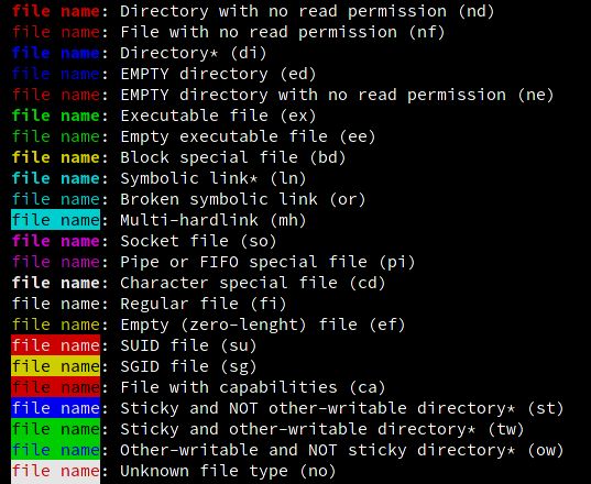 Colors for different file types, such as directory, regular files, and so on | Here |