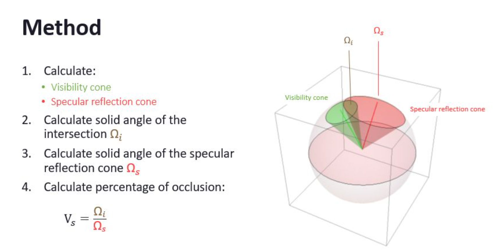 half ReflectionOcclusion = ApproximateConeConeIntersection(ReflectionConeAngle, UnoccludedAngle, AngleBetween);//BentNormal作为VisibilityCone去和SpecularCone求交得到ReflectionOcclusion
