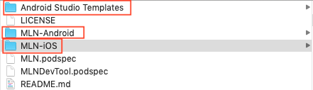 序号 目录 功能描述 1. Android Studio Templates AS 模板(桥接Bridge的几种类型) 2. MLN-Android Android sdk源代码+demo工程(美丽说、其他demo) 3. MLN-iOS iOS sdk源代码+demo工程(美丽说、其他demo)