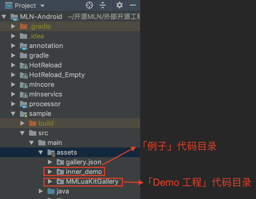 2)在Android Studio3.5版本上若遇到gradle不适配问题,请使用工程中推荐gradle 5.1.1版本,gradle plugin使用3.4.0版本,然后点击工具栏中的Sync Project With Gradle Files即可。Android工程里「例子」和「Demo工程」的lua代码存放路径如下图所示: