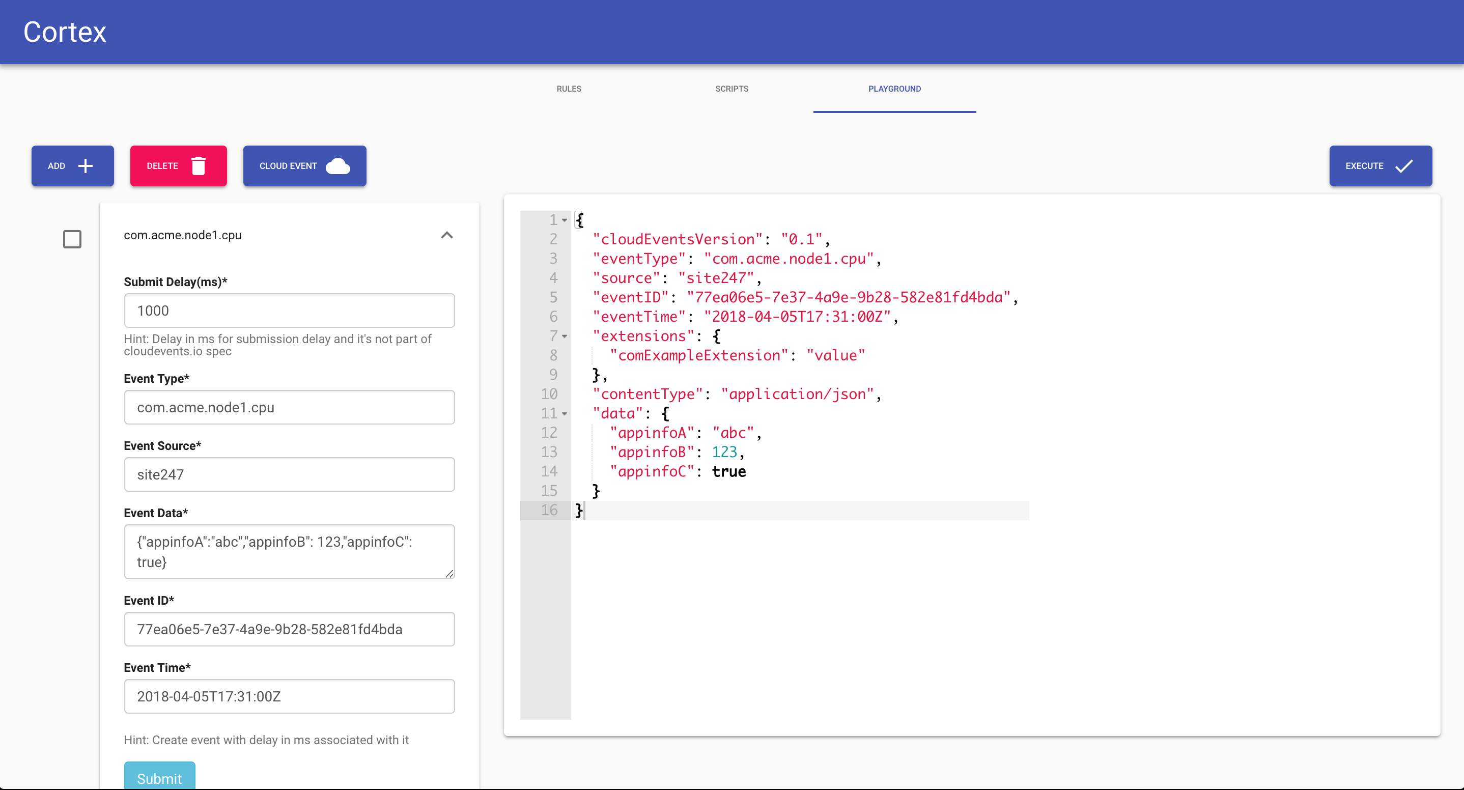 - React UI for creating new rules, correlation scripts, list of rule execution history and a playground to simulate correlation executions.