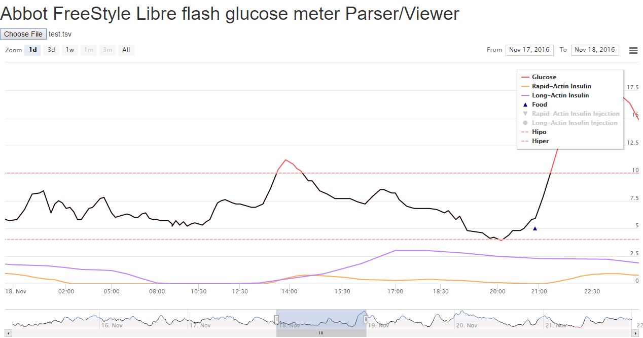 Mount a local web-server (for example using node's http-server) and browse to the index.html (for example http://127.0.0.1:8080/index.html) to open the main view that lets you import a tsv file generated from the Abbott FreeStyle Libre app (or use the test.tsv example file) and visualize the data in the HighChart chart.