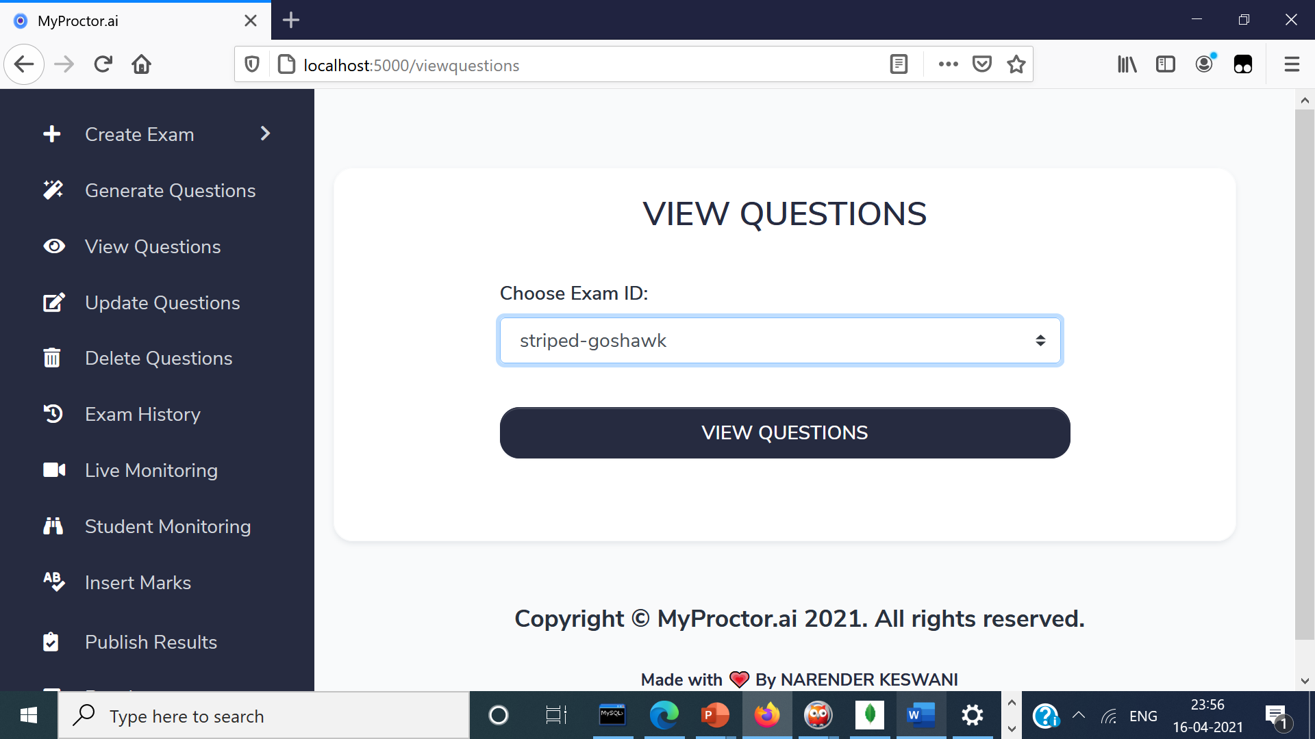- Professor can create exam, view exam history, share details of exam with students, view questions, update, delete questions, but update & delete questions will not work at the time of exam & after the exam.
