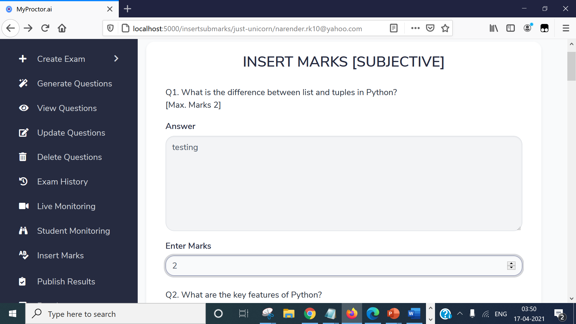 - Professor can insert marks of subjective & practical exam & also publish the results, view results.