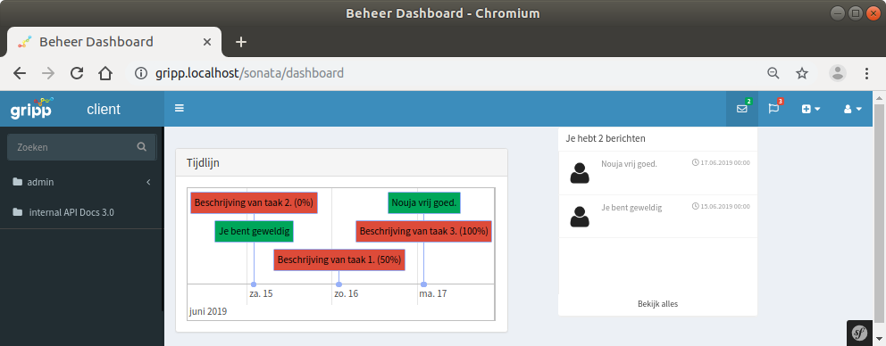 The dashboard contains the vis.js Timeline, for now only with, entries of the messages and tasks: