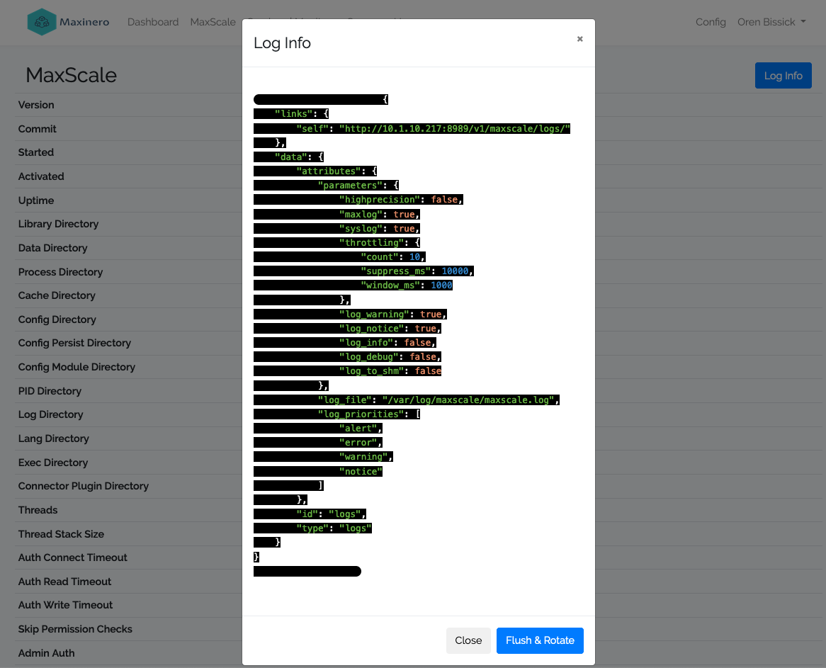 This shows the current maxscale log settings, user can also flush the log from here.