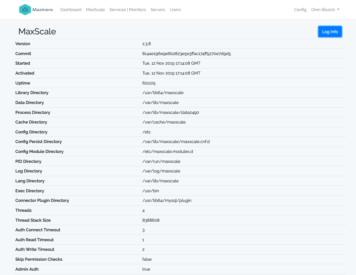 This page shows the current settings of the current selected maxscale server.