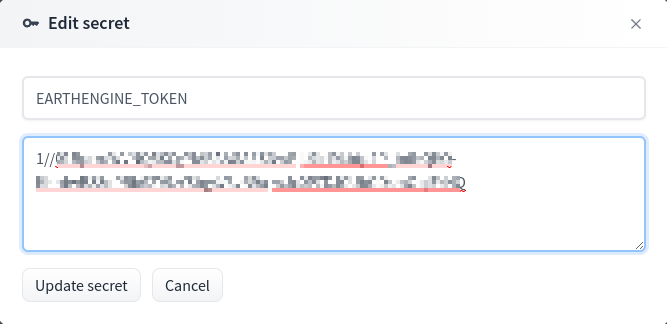 EARTHENGINE_TOKENin order to use Earth Engine. The token value should be copied from the following file depending on your operating system:Windows: C:\\Users\\USERNAME\\.config\\earthengine\\credentials Linux: /home/USERNAME/.config/earthengine/credentials MacOS: /Users/USERNAME/.config/earthengine/credentialsSimply open the file and copy ALL the content to the
