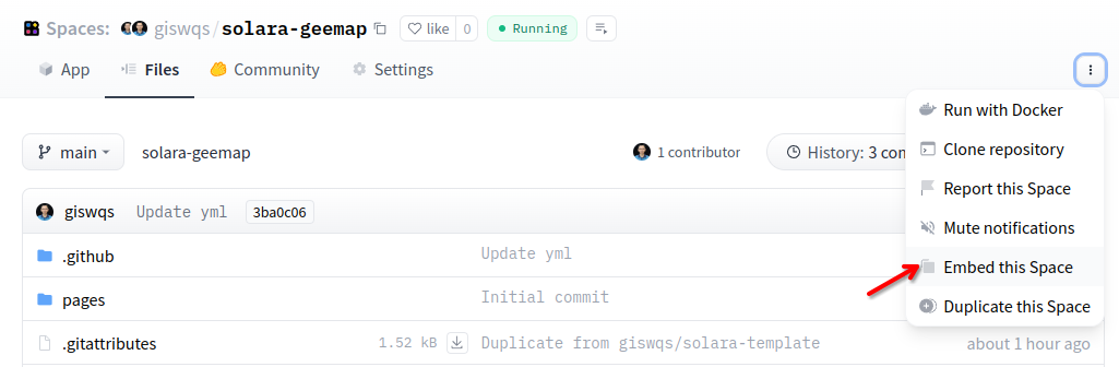 Embed this Spacemenu and find theDirect URLfor the app, such as https://giswqs-solara-geemap.hf.space. -