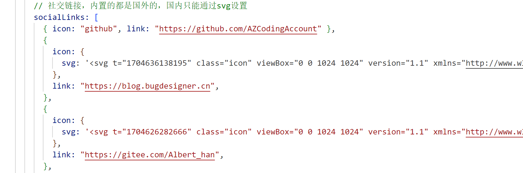 - vitepress原生支持国外的sociallink,如果是国内需要自行复制svg代码。如图:
