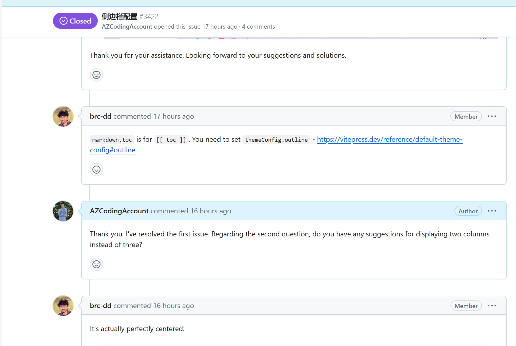 到最后遇到问题你只能提issue,这个时候就得看负责维护这个项目团队的积极性了,vitepress团队还是很奈斯的,我今天两点提了个issue8分钟就回复了,也得益于美国跟咱这边有时差。